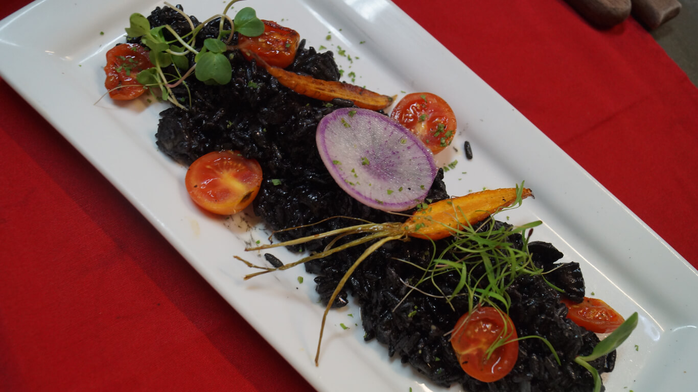 Marinado con vino blanco y un toque de salsa soya, terminado a la plancha servido con berenjenas crocantes, zuchinni asado y espárragos al dente.